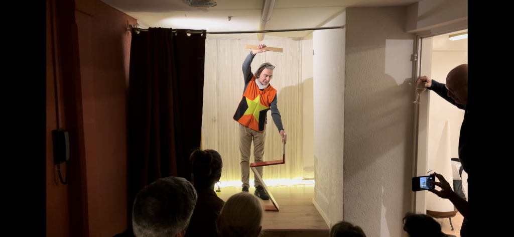 In his work, Zurich-based performer Robert Wettstein explores the surprising parallels between the Zurich DADA movement and the Dutch De Stijl group. The starting point for his performance is an iconic piece of furniture: the Zig Zag chair, designed by Gerrit Thomas Rietveld in 1932. Since 1919, Rietveld had been a member of the De Stijl movement founded by Theo van Doesburg and Piet Mondrian, which had a decisive influence on modernism with its radical reduction, clear lines, and universal design language.
