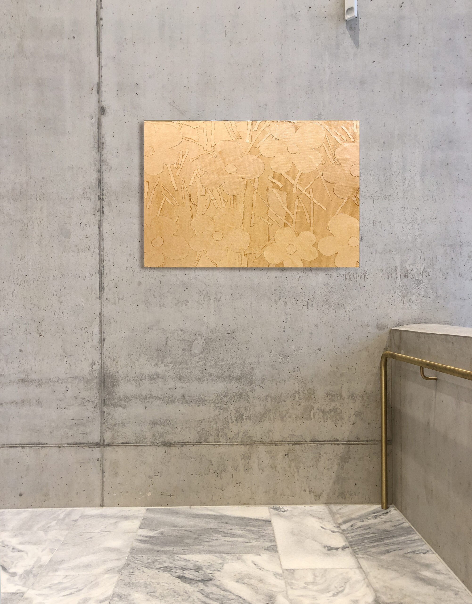 Tribut-Sammlung. Andy Warhol, Blumen 1965. Neu interpretiert mit der Pfingstweidblume in Papier 2025. Maße 50cm x 60cm auf Wabenplatte. Linke Seite Visualisierung in einem Raum von David Chipperfield.