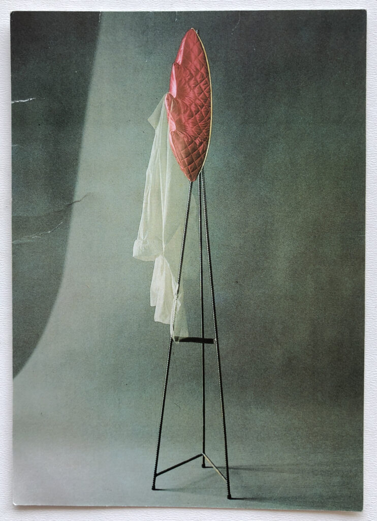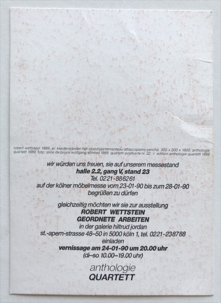 Coat stand ER, Design1989, for Anthologie Quartett. Postcard no. 32 for the Gallerie exhibition in Cologne 1990. Front and back side. Foto Alice de Bruyn Alexander Schmid.