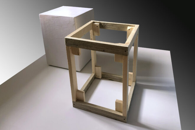The production makes no noise and goes very slowly. Each strip of paper is applied individually. To make the cube stable you need many layers of paper. Because the Normal wallpaper paste is applied wet, it takes a long time to dry. This gives the necessary tension and makes the layers of paper strong.
